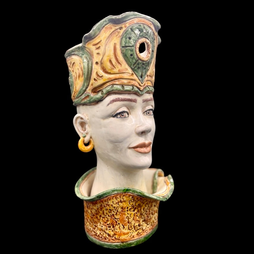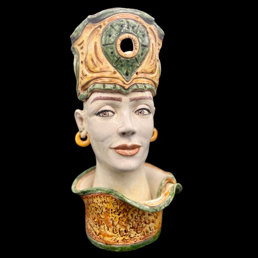 Opera in ceramica realizzata interamente a mano, ispirata alle iconiche teste di moro della tradizione siciliana, qui reinterpretata con tratti realistici e una forte presenza scenica. Ricca di dettagli e finiture preziose, questa creazione si distingue per l’eleganza dei colori, la cura dei particolari e la maestria nell’espressione del volto.