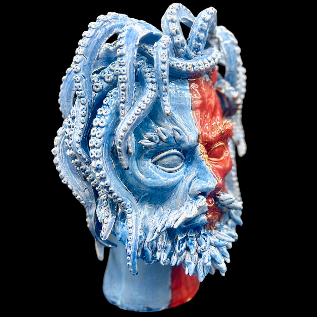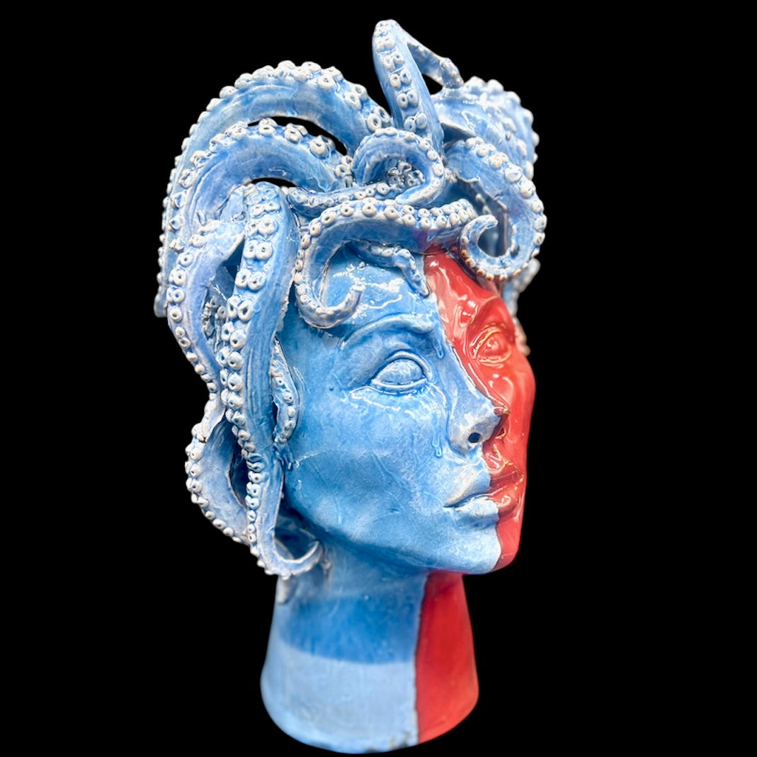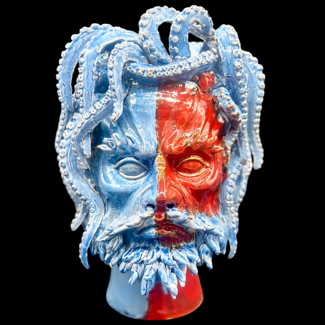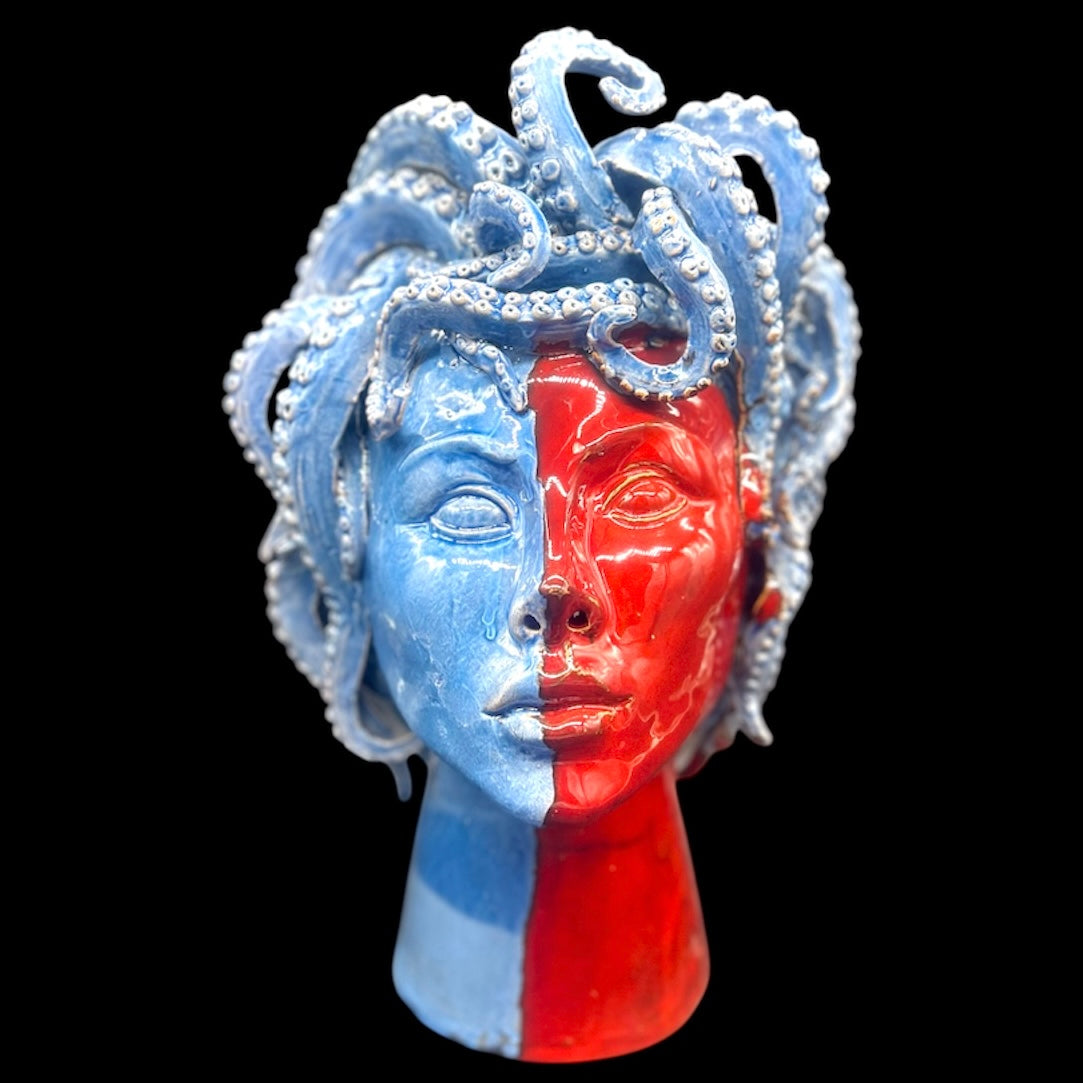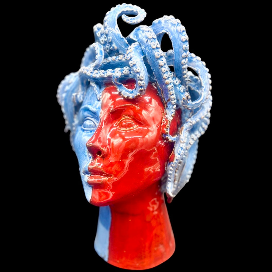 Questa straordinaria coppia di Teste di Moro reinterpreta in chiave contemporanea il mito siciliano, fondendo tradizione e originalità. I volti sono divisi cromaticamente in due metà, rosso e blu, enfatizzando il contrasto tra passione e profondità. I capelli si trasformano in dinamici tentacoli di polpo, che avvolgono e caratterizzano le figure con un forte impatto visivo.