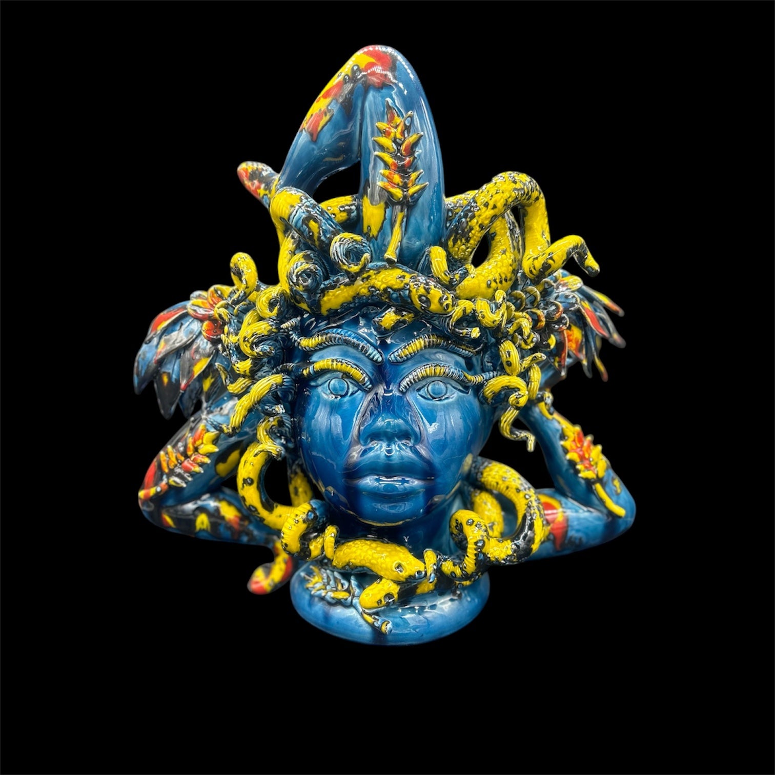 Scultura in ceramica di forte personalità, ispirata al mito di Medusa e realizzata interamente a mano secondo la tradizione ceramica di Santo Stefano di Camastra. I colori vivaci e smaltati, il blu intenso e il giallo dei serpenti intrecciati creano un contrasto deciso e ricco di energia.